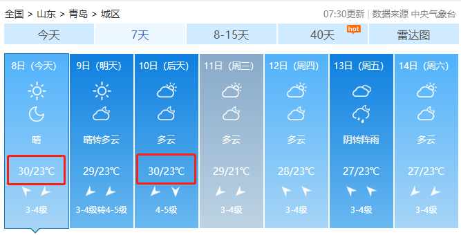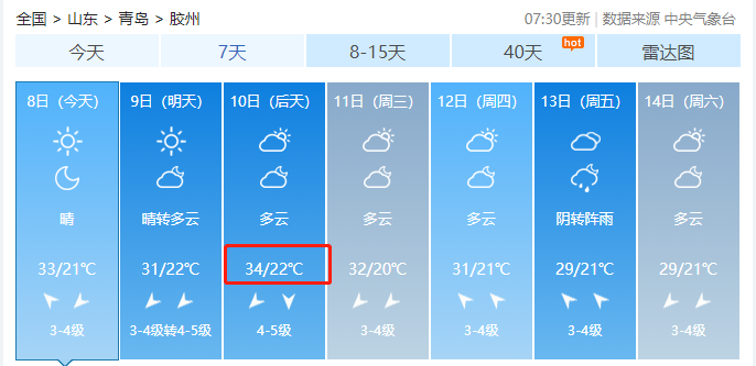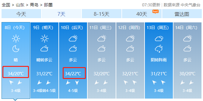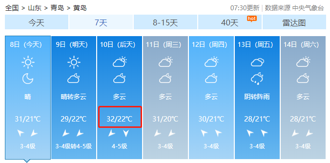 ?10日,最低氣溫市區(qū)和沿海地區(qū)21~22℃,內(nèi)陸地區(qū)最低20℃左右,10日白天最高氣溫市區(qū)和沿海地區(qū)31℃左右,內(nèi)陸地區(qū)最高33~35℃。