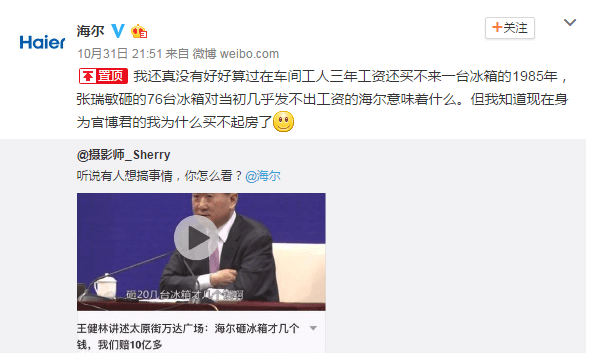 在近幾年,仍為大家津津樂(lè)道。2016年11月2日,王健林講述沈陽(yáng)太原街萬(wàn)達(dá)廣場(chǎng)賠錢(qián)“比海爾砸冰箱偉大多了”的視頻在網(wǎng)上流傳,海爾公司官方微博對(duì)此番言論予以回?fù)?,并引發(fā)其它眾多企業(yè)微博“列隊(duì)”力挺。