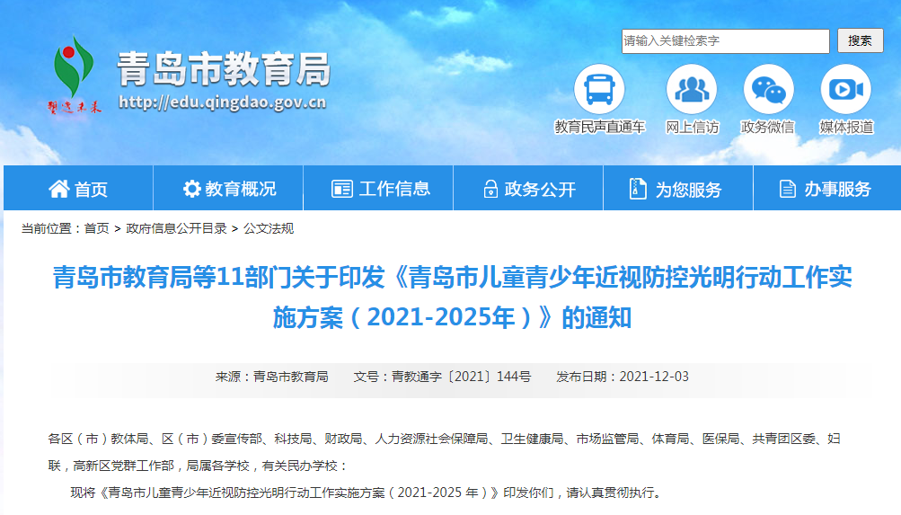 《青島市兒童青少年近視防控光明行動(dòng)工作實(shí)施方案(2021-2025年)》對(duì)外公布。