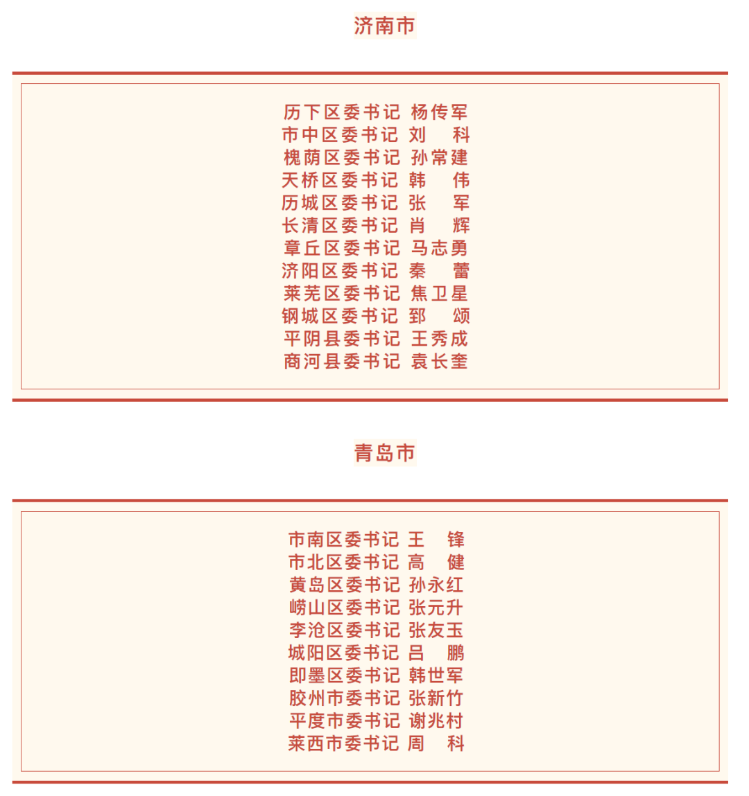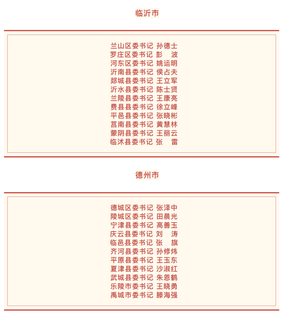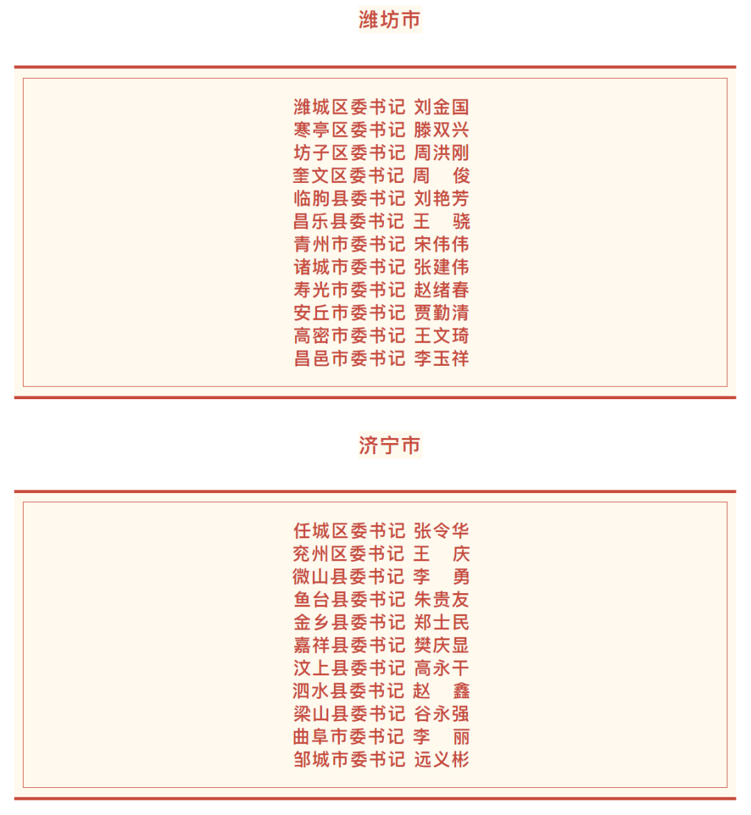 日前,山東136個縣(市、區(qū))黨委領(lǐng)導(dǎo)班子換屆工作基本完成,各縣(市、區(qū))新一屆黨委書記名單如下。