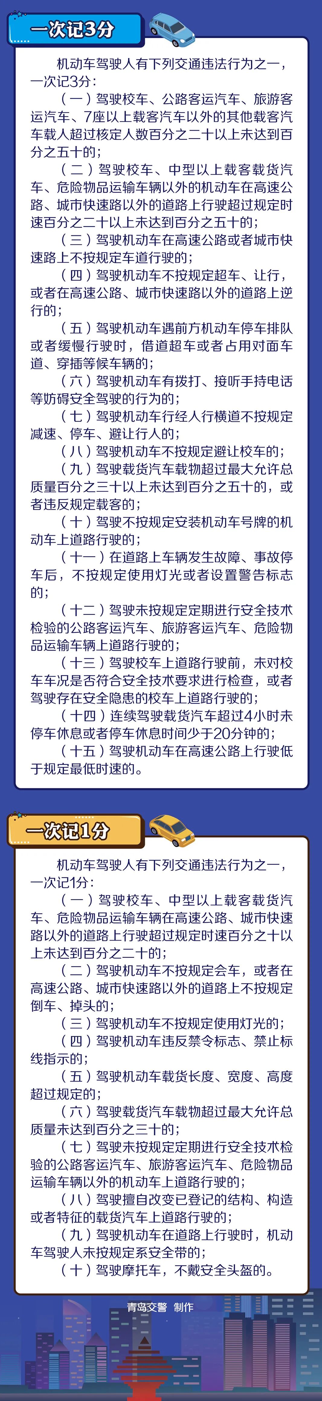 ●二是優(yōu)化調整記分分值。在保持對酒后駕駛、交通肇事致人傷亡后逃逸、使用偽造變造牌證等嚴重妨礙交通安全的交通違法行為管理力度的前提下,降低了部分交通違法行為記分分值,刪除了駕車未放置檢驗標志、保險標志等交通違法行為記分。