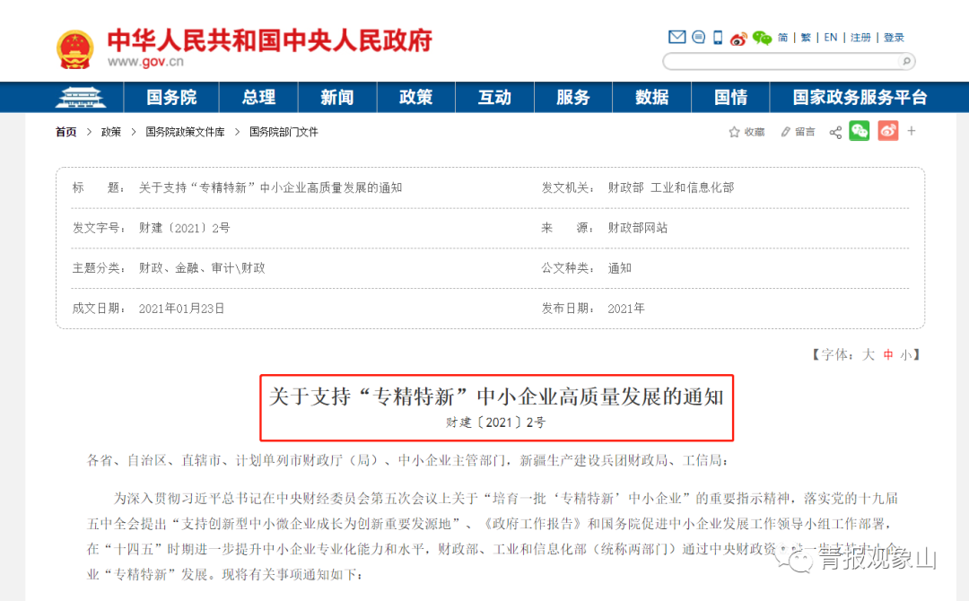 去年1月,財政部、工信部聯(lián)合印發(fā)《關(guān)于支持“專精特新”中小企業(yè)高質(zhì)量發(fā)展的通知》,提出2021-2025年,中央財政累計安排100億元以上獎補資金,重點支持1000余家國家級專精特新“小巨人”企業(yè)高質(zhì)量發(fā)展,帶動1萬家左右中小企業(yè)成長為國家級專精特新“小巨人”企業(yè)。
