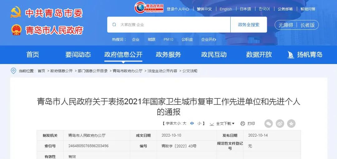 青島市人民政府關于表揚2021年國家衛(wèi)生城市復審工作先進單位和先進個人的通報