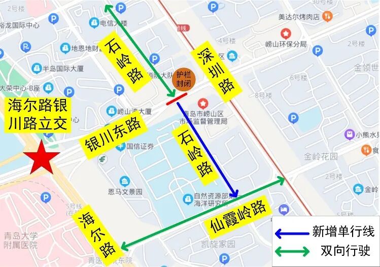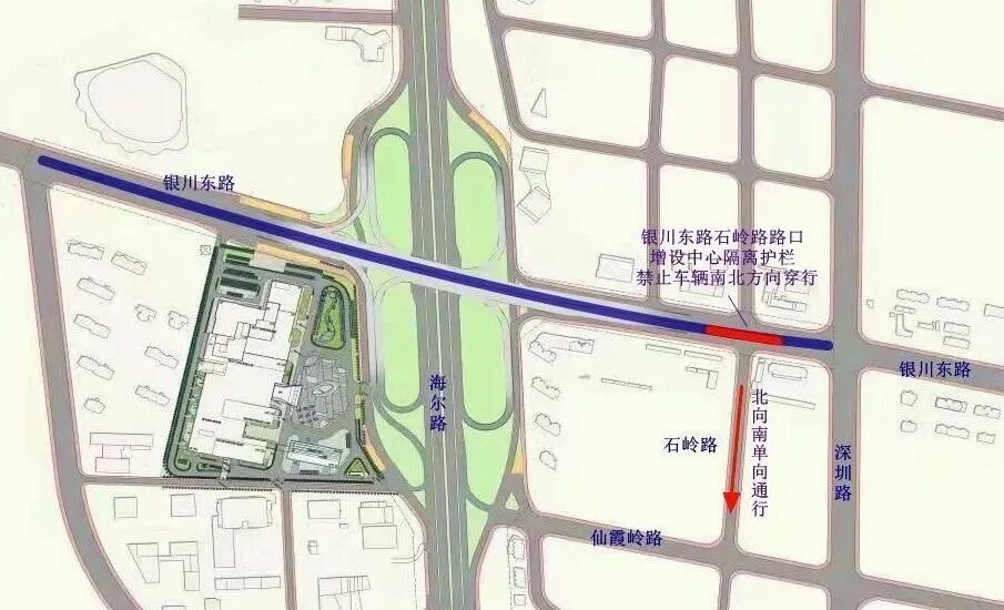 3、為提升銀川東路西向東方向通行能力,在石嶺路(銀川東路至仙霞嶺路)路段設(shè)置為北向南單向通行,欲沿石嶺路向北行駛車輛,請沿深圳路或海爾路向北行駛。