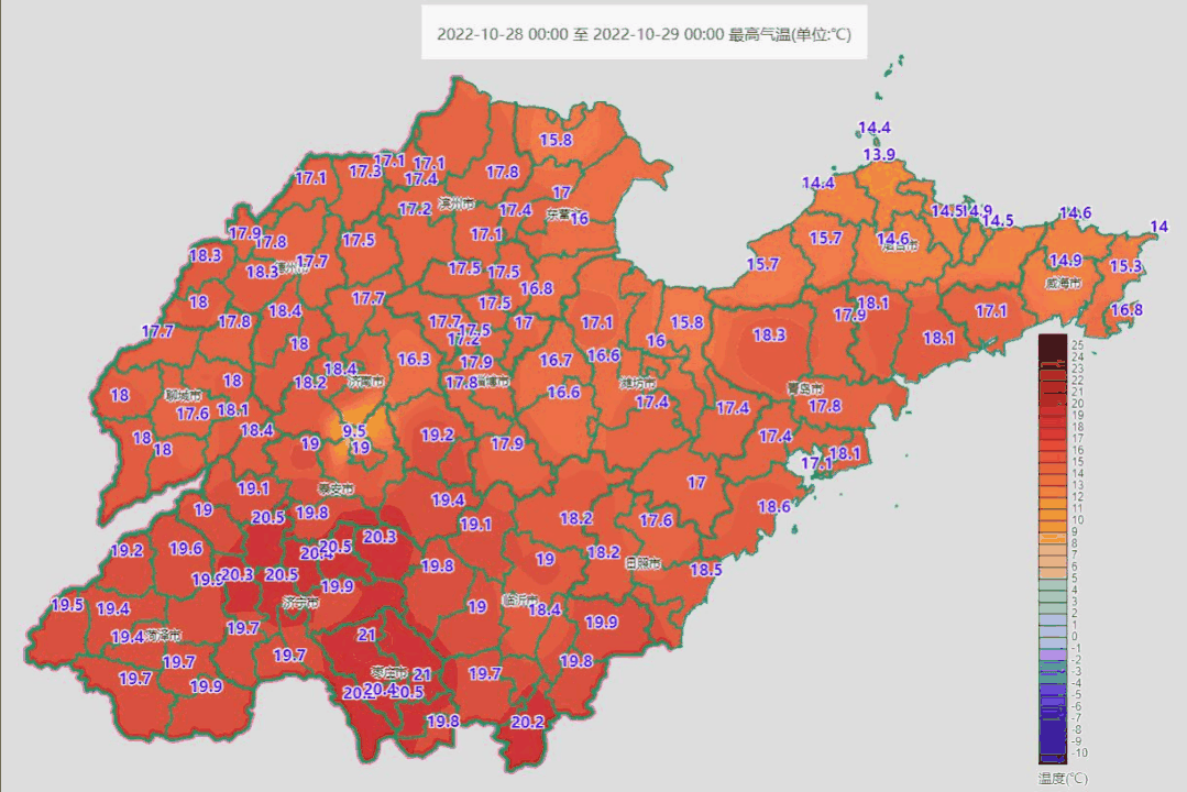 最高氣溫:魯中山區(qū)和半島內陸地區(qū)14℃左右,其他地區(qū)16℃左右。