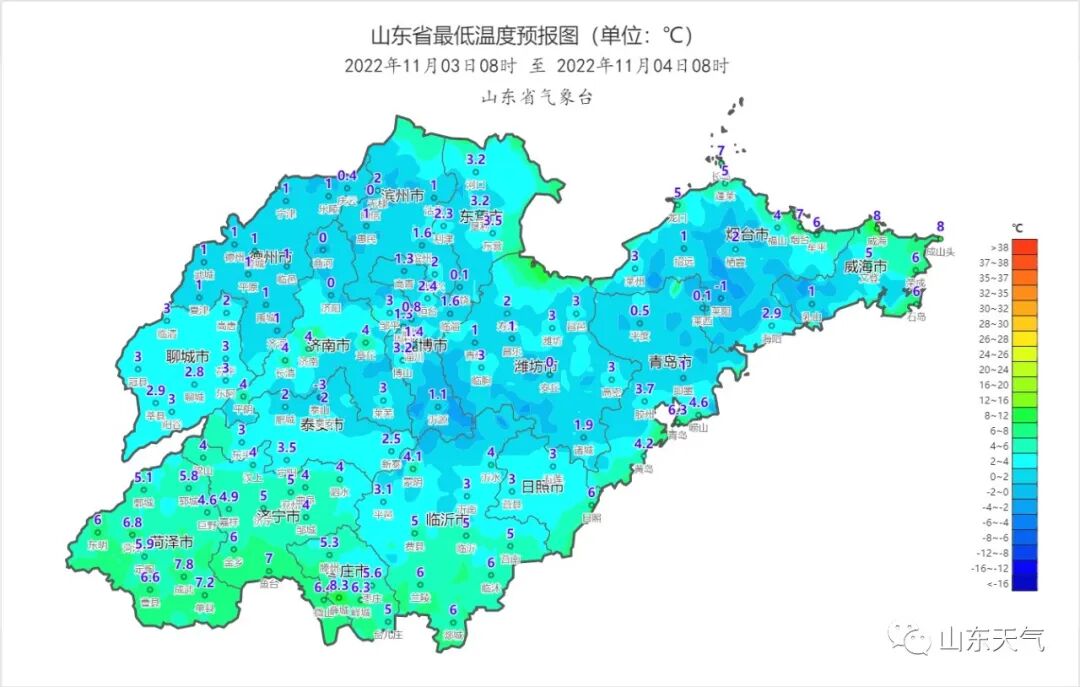 最低氣溫:魯西北、魯中和半島內陸地區(qū)0~2℃,有霜凍;其他地區(qū)6℃左右。