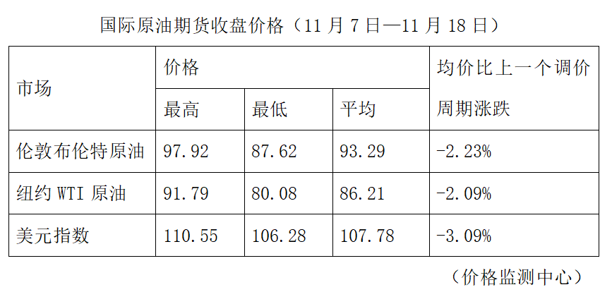 調(diào)價周期內(nèi),美元指數(shù)從高點回落,平均比上個周期下跌3.09%,一定程度提振以美元計價的原油價格,但市場對全球經(jīng)濟及原油需求增速下滑的擔(dān)憂再度升溫,油價因此承壓下跌。美聯(lián)儲稱,為遏制通脹,12月繼續(xù)加息的可能性依然存在。市場再度擔(dān)憂“激進加息”可能導(dǎo)致全球經(jīng)濟增長放緩,進而抑制原油需求。國際貨幣基金組織稱全球經(jīng)濟增長面臨多重不利因素,增速放緩愈加明顯。歐佩克月度報告預(yù)測今明兩年全球原油需求增速分別為255萬桶/日、224萬桶/日,均比上月預(yù)測值下調(diào)10萬桶/日,這也是歐佩克自4月以來第5次下調(diào)對今年全球原油需求增長的預(yù)期。此外,美國汽油庫存增長也對原油價格造成打壓。平均來看,本輪調(diào)價周期倫敦布倫特、紐約WTI油價分別比上個調(diào)價周期下降2.23%、2.09%。