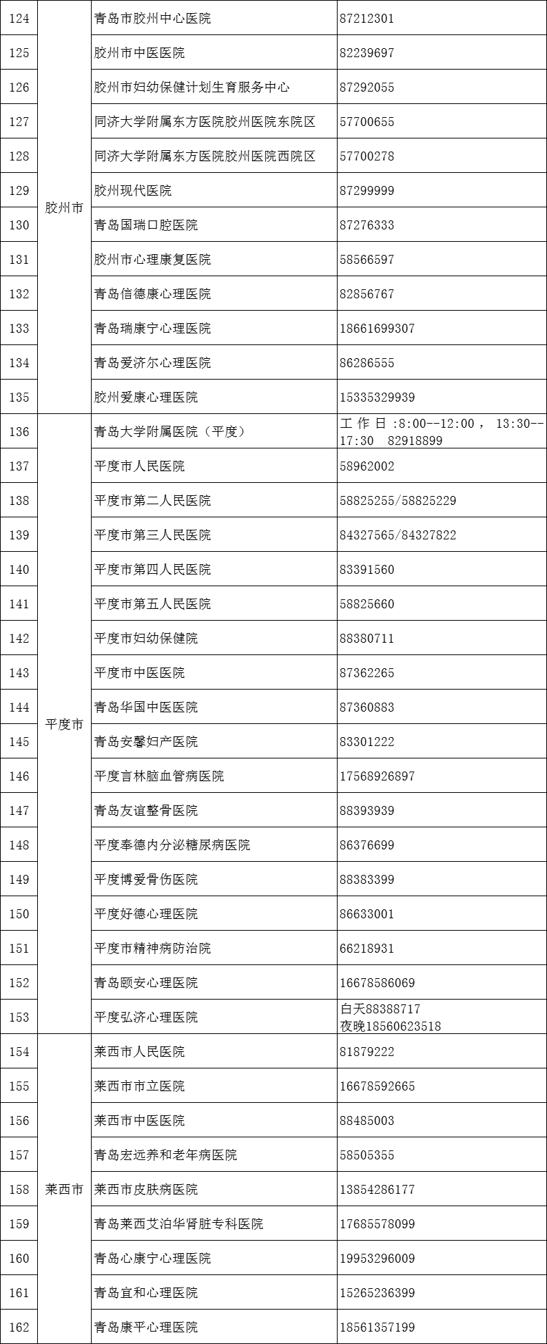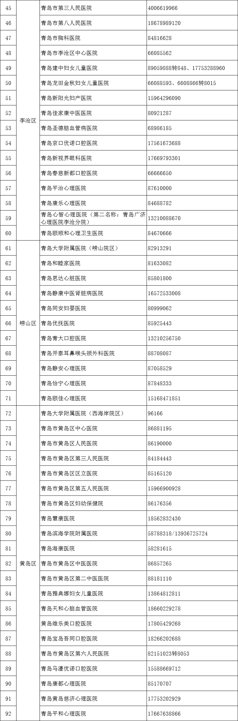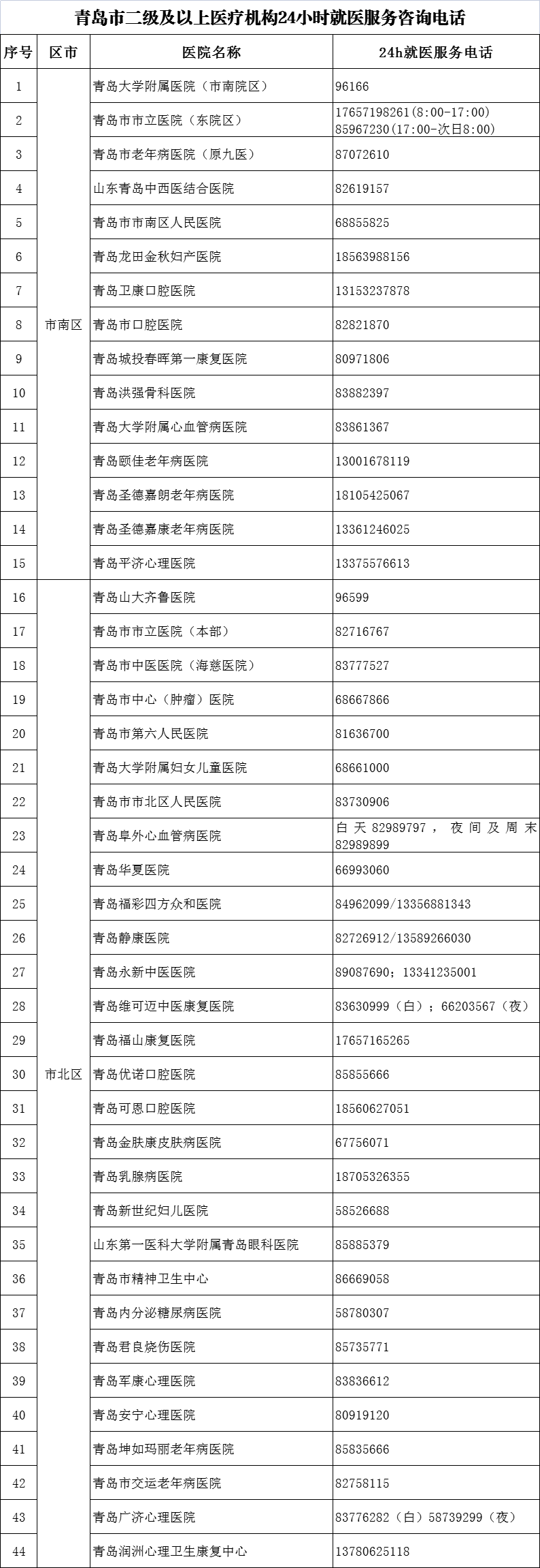 為滿足目前疫情形勢下群眾醫(yī)療服務需求,減少人員流動,降低感染風險,避免醫(yī)療資源擠兌,現(xiàn)將青島市二級及以上醫(yī)療機構24小時就醫(yī)服務咨詢電話公布如下,方便廣大市民進行健康咨詢。
