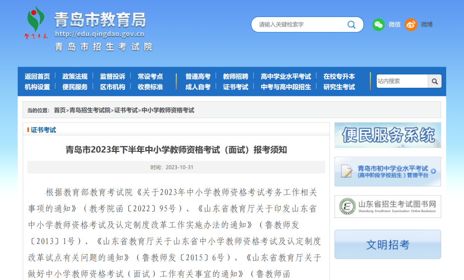 根據(jù)教育部教育考試院《關(guān)于2023年中小學(xué)教師資格考試考務(wù)工作相關(guān)事項的通知》(教考院函〔2022〕95號)、《山東省教育廳關(guān)于印發(fā)山東省中小學(xué)教師資格考試及認(rèn)定制度改革工作實施辦法的通知》(魯教師發(fā)〔2013〕1號)、《山東省教育廳關(guān)于山東省中小學(xué)教師資格考試及認(rèn)定制度改革試點有關(guān)問題的通知》(魯教師發(fā)〔2015〕6號)、《山東省教育廳關(guān)于做好中小學(xué)教師資格考試(面試)工作有關(guān)事宜的通知》(魯教師函〔2021〕10號)等文件規(guī)定和山東省工作安排,現(xiàn)將2023年下半年中小學(xué)教師資格考試(面試)報名有關(guān)事項公告如下: