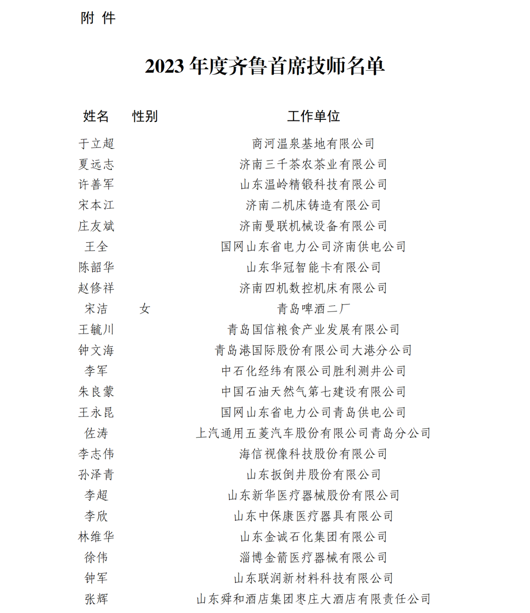 近日,山東省委組織部、山東省人力資源和社會(huì)保障廳、山東省財(cái)政廳發(fā)布《關(guān)于公布2023年度齊魯首席技師名單的通知》,確定于立超等146人為2023年度齊魯首席技師。具體名單如下: