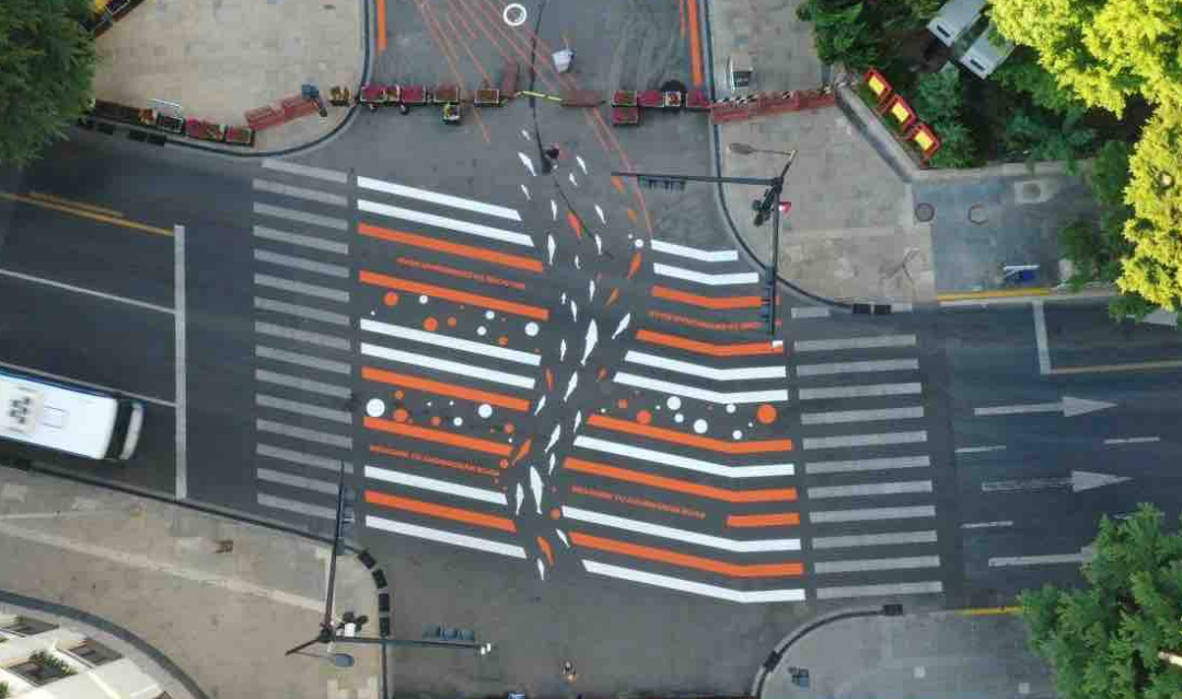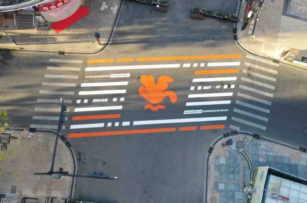 在湖南路路段,斑馬線利用視覺錯覺技術,通過色彩、透視的繪畫技巧,在二維平面上創(chuàng)造出三維立體的視覺效果,為城市空間增添了趣味性、藝術性和引導性。將藝術融入日常生活,融入老建筑圖案以及中山路和上街里的LOGO,為城市增添藝術氣息,提升城市美學。