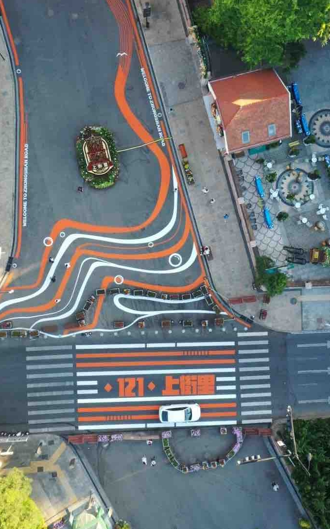 在中山路斑馬線改造升級中,斑馬線的色彩采用了與中山路壹號建筑相得益彰的橙紅色調,不僅與地標建筑色彩搭配和諧,更增添了一抹生動活力,營造出視覺上的完美統(tǒng)一,彰顯街區(qū)的個性魅力。“在設計中,我們巧妙融入了‘121上街里’品牌標識的精髓,通過這一細節(jié)處理,不僅強化了空間的地域標識性,還提升了街區(qū)的文化內涵與辨識度,使之成為一張行走的文化名片,助力街區(qū)品牌形象的顯著提升,讓每一步行走都成為一次與城市文化的親密對話。”市南區(qū)歷史城區(qū)保發(fā)局工作人員介紹。
