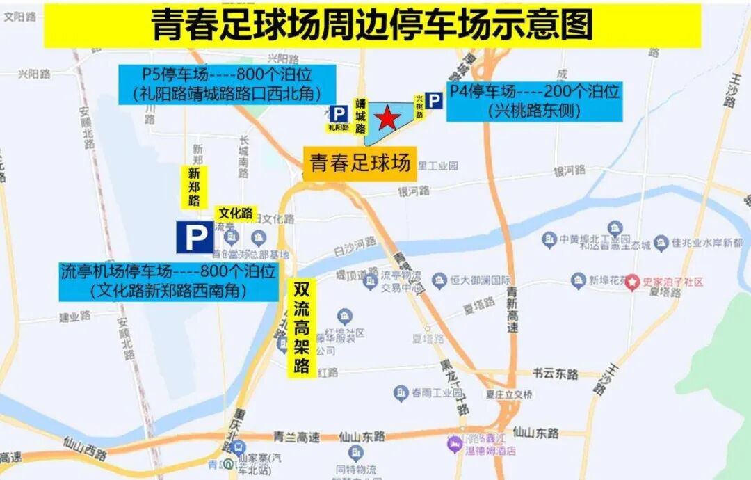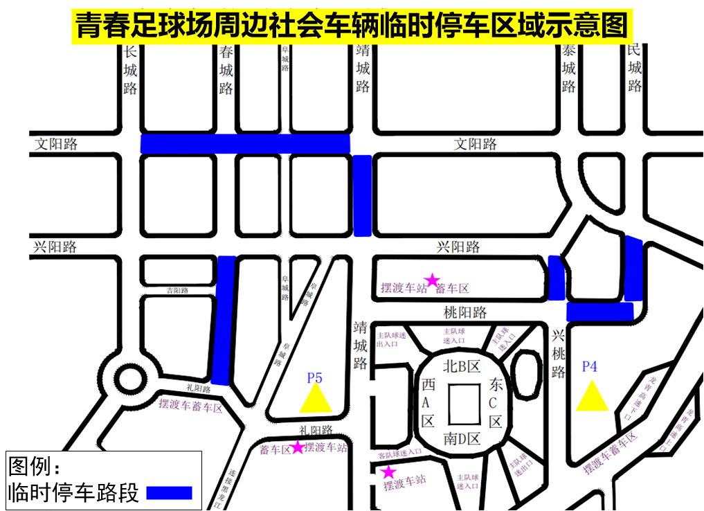 除上述駛往停車場(chǎng)路線外,自駕車輛可在到達(dá)足球場(chǎng)區(qū)域后,經(jīng)厚城路至靖城路、春城路、興桃路、桃陽(yáng)路、民城路、文陽(yáng)路臨時(shí)停車區(qū)域停車。