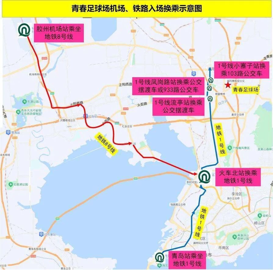 1.從鐵路青島北站抵達(dá)的球迷,在地鐵青島北站乘地鐵1號(hào)線往東郭莊方向列車至流亭站、鳳崗路站或小寨子站下車,乘公交車或擺渡車抵達(dá)足球場(chǎng)。