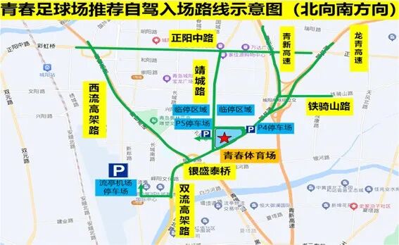 (1)沿青蘭高速(或雙元路)→雙流高架路→銀盛泰橋至厚城路,經(jīng)興桃路進(jìn)入P4停車場(chǎng),或經(jīng)靖城路→禮陽(yáng)路進(jìn)入P5停車場(chǎng)。(2)沿青蘭高速(或雙元路)→雙流高架路→迎賓路→桃仙路進(jìn)入流亭機(jī)場(chǎng)停車場(chǎng),乘擺渡車抵達(dá)足球場(chǎng)。