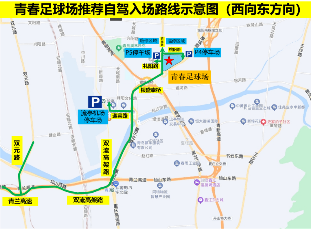 (3)青新高速、龍青高速方向來(lái)車,沿青新高速(龍青高速)→城陽(yáng)南立交至厚城路,經(jīng)興桃路進(jìn)入P4停車場(chǎng),或經(jīng)靖城路→禮陽(yáng)路進(jìn)入P5停車場(chǎng)。