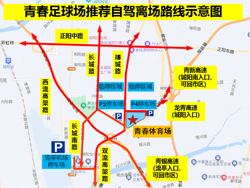 (5)P4停車場(chǎng)沿興桃路→厚城路向北,由城陽(yáng)入口進(jìn)入龍青高速或由城陽(yáng)南入口進(jìn)入青新高速(可返回市區(qū))。
