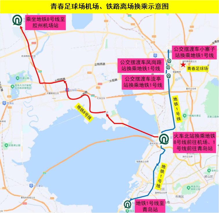 去往膠東國(guó)際機(jī)場(chǎng)的球迷,在地鐵1號(hào)線小寨子、鳳崗路、流亭地鐵站乘坐往王家港方向列車到達(dá)青島北站,換乘地鐵8號(hào)線往膠州北站方向列車至膠東機(jī)場(chǎng)下車。