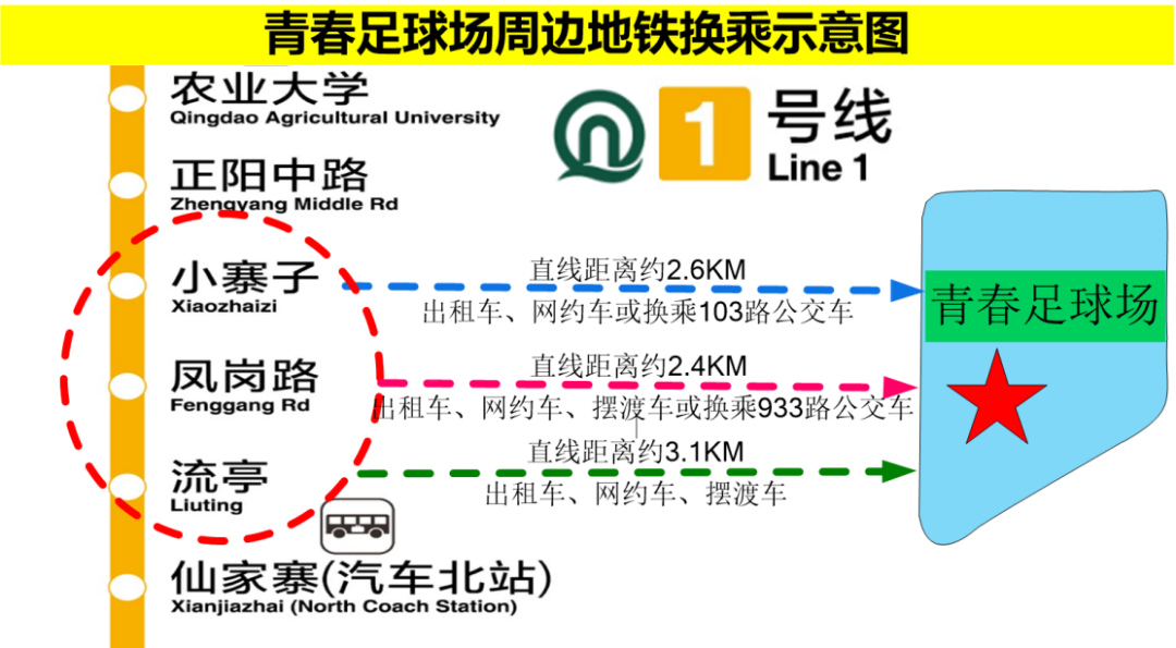 1.去往鐵路青島北站的球迷,在地鐵1號(hào)線小寨子、鳳崗路、流亭地鐵站乘坐往王家港方向列車至青島北站下車。