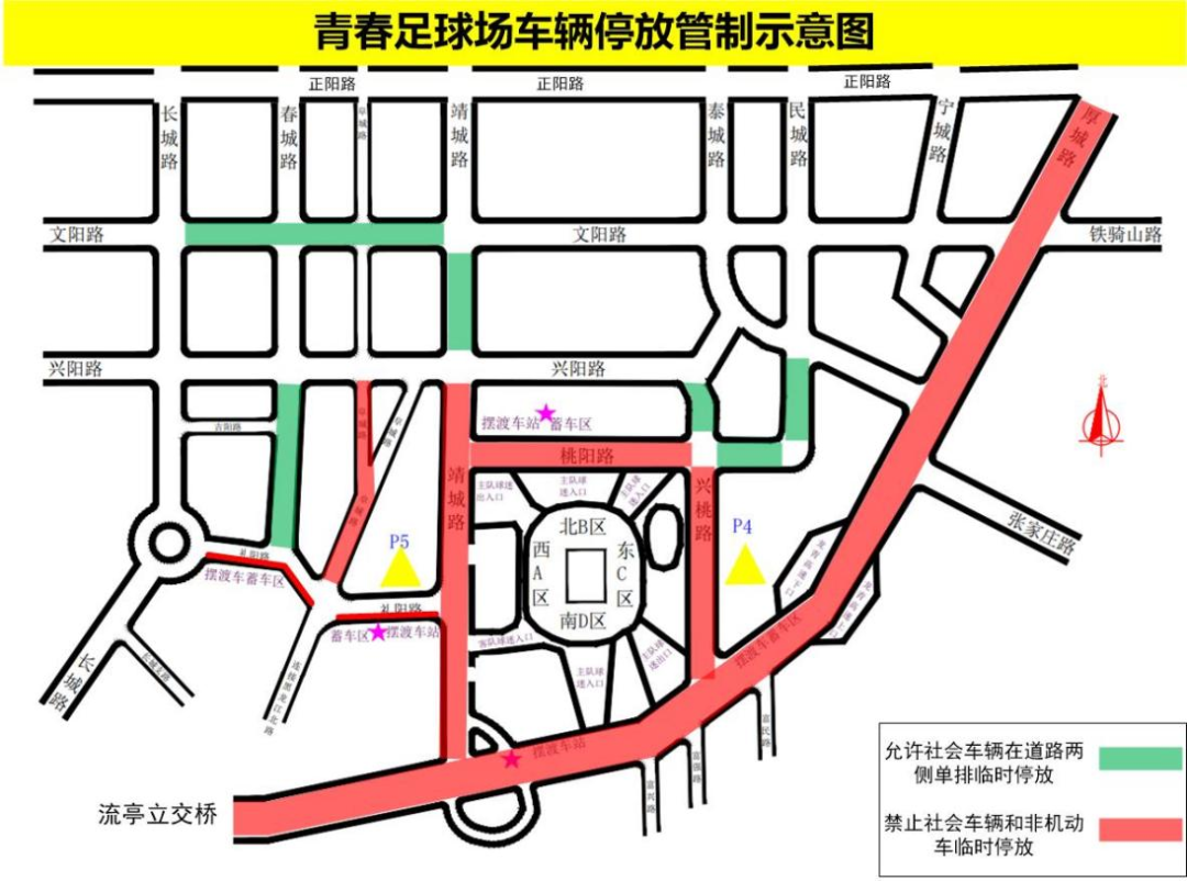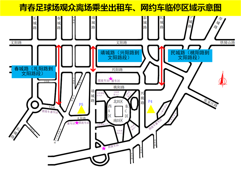比賽結(jié)束后,在春城路(禮陽(yáng)路到文陽(yáng)路段)、靖城路(興陽(yáng)路到文陽(yáng)路段)、民城路(桃陽(yáng)路到文陽(yáng)路段)設(shè)置出租車、網(wǎng)約車臨時(shí)停靠區(qū)域,請(qǐng)球迷朋友到指定區(qū)域乘車。