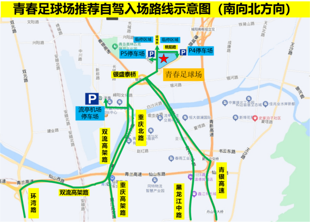 (3)P4停車場(chǎng)沿興桃路→興陽(yáng)路→靖城路→厚城路→銀盛泰橋往青銀高速、黑龍江中路方向。