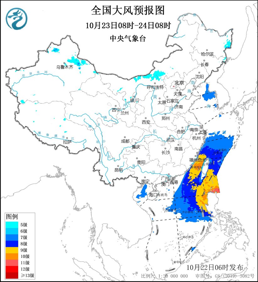 10月23日08時(shí)至24日08時(shí),臺灣海峽、巴士海峽將有9~10級、陣風(fēng)11~12級的大風(fēng),其中巴士海峽的部分海域風(fēng)力可達(dá)11~12級、陣風(fēng)13~14級,東海南部海域、臺灣以東洋面、南海東北部和中東部海域?qū)⒂?~9級、陣風(fēng)10~11級的大風(fēng),其中南海中東部的部分海域風(fēng)力可達(dá)10級、陣風(fēng)11~12級。