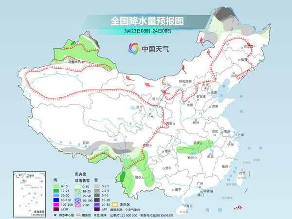明天,內(nèi)蒙古中東部、新疆北疆北部和沿天山地區(qū)、河北北部等地部分地區(qū)有小雪或雨夾雪,其中,內(nèi)蒙古東南部等地部分地區(qū)有中到大雪。