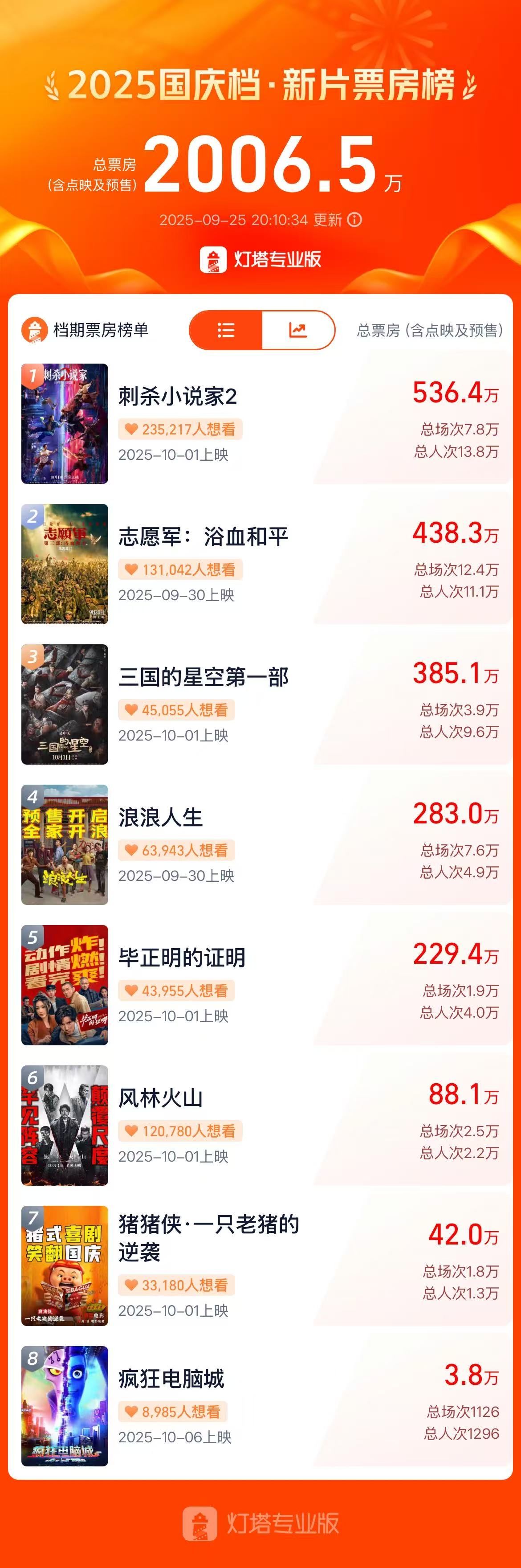 2025國(guó)慶檔新片總票房突破2000萬(wàn),《刺殺小說(shuō)家2》領(lǐng)跑