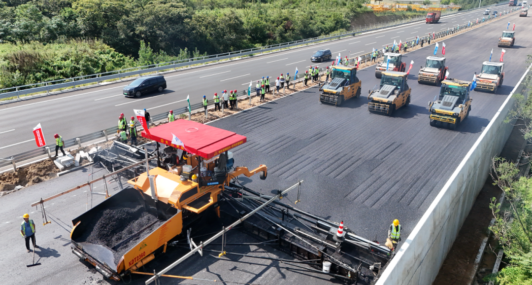 觀海新聞?dòng)浾吡私獾剑?500余名建設(shè)者、750余臺(tái)設(shè)備假期不停工;主線瀝青面層攤鋪基本完成,正全力推進(jìn)伸縮縫、交安、機(jī)電、房建及綠化等工程。