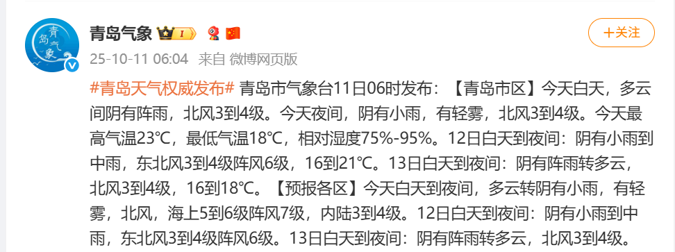 青島日?qǐng)?bào)社/觀海新聞10月11日訊 觀海新聞自“青島氣象”獲悉,青島市氣象臺(tái)11日06時(shí)發(fā)布:【青島市區(qū)】今天白天,多云間陰有陣雨,北風(fēng)3到4級(jí)。今天夜間,陰有小雨,有輕霧,北風(fēng)3到4級(jí)。今天最高氣溫23℃,最低氣溫18℃,相對(duì)濕度75%-95%。12日白天到夜間:陰有小雨到中雨,東北風(fēng)3到4級(jí)陣風(fēng)6級(jí),16到21℃。13日白天到夜間:陰有陣雨轉(zhuǎn)多云,北風(fēng)3到4級(jí),16到18℃。
