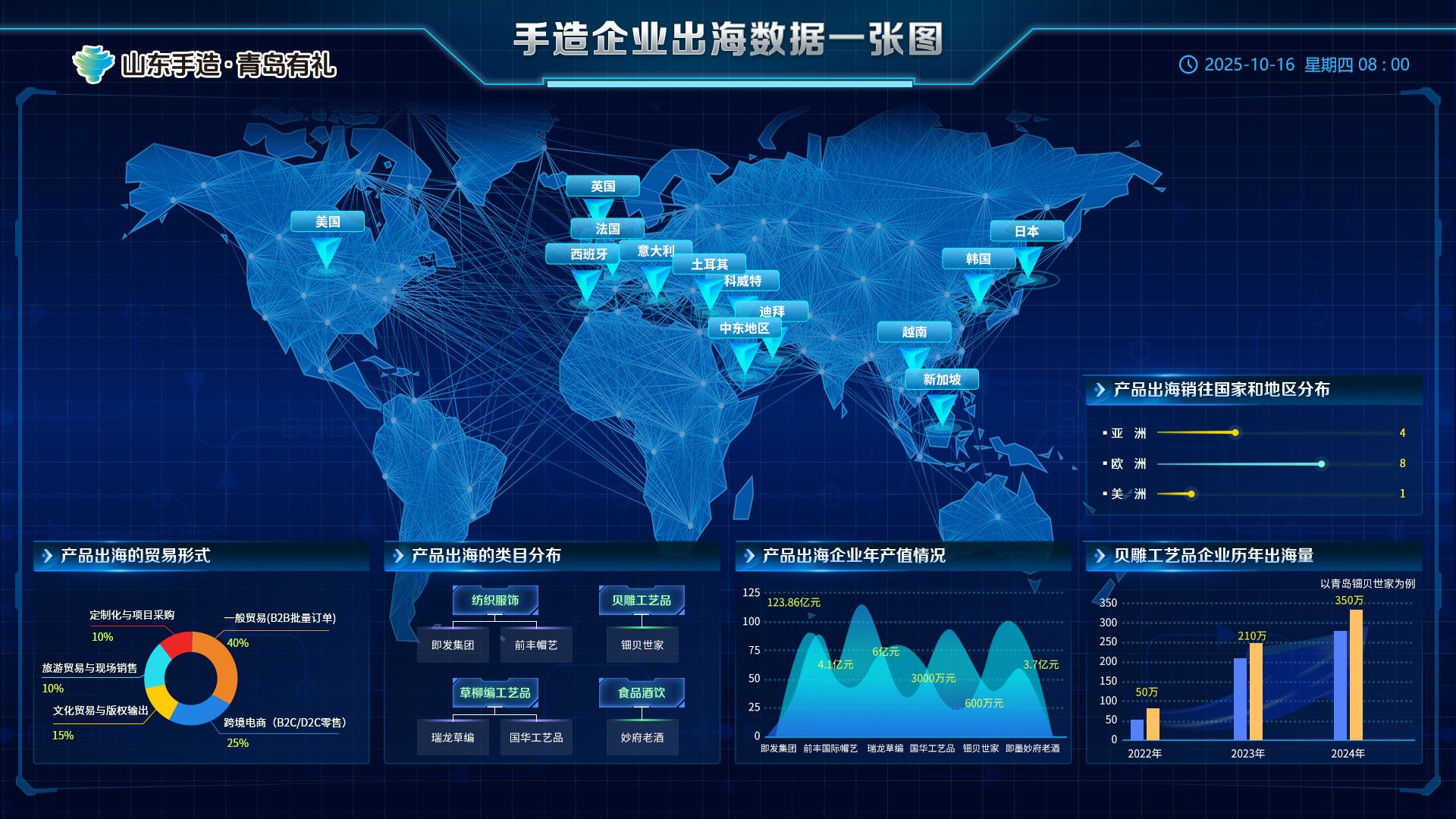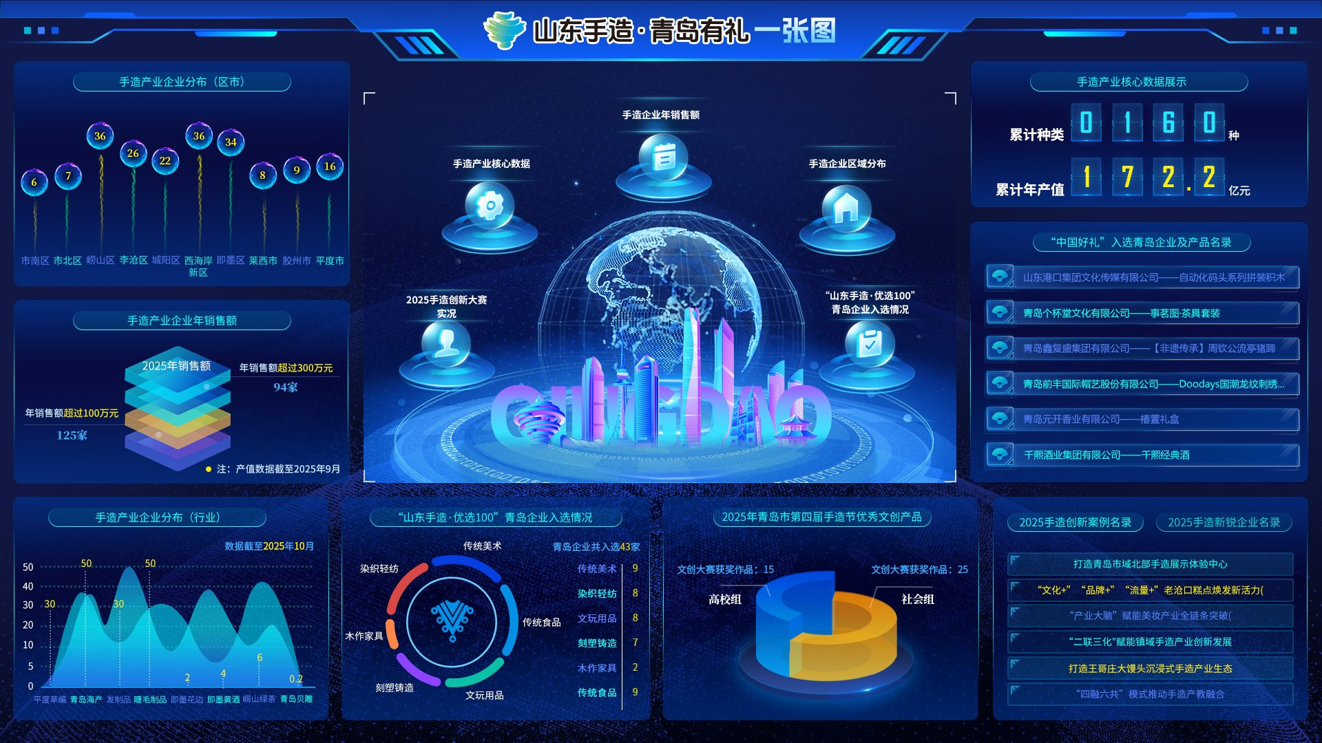 “數(shù)智賦能創(chuàng)意引領(lǐng)”板塊成為現(xiàn)場頗受關(guān)注的區(qū)域?!暗诙檬衷飚a(chǎn)業(yè)創(chuàng)新案例、手造新銳企業(yè)”以及“2025年第四屆手造節(jié)優(yōu)秀文創(chuàng)產(chǎn)品征集”活動的精選作品,充分彰顯了創(chuàng)新創(chuàng)意對傳統(tǒng)手工藝的賦能以及青島手造產(chǎn)業(yè)在數(shù)字化轉(zhuǎn)型、產(chǎn)業(yè)化發(fā)展、市場化運營等方面的成果。手造出海等數(shù)據(jù)地圖,生動呈現(xiàn)青島手造企業(yè)的國際化發(fā)展情況。