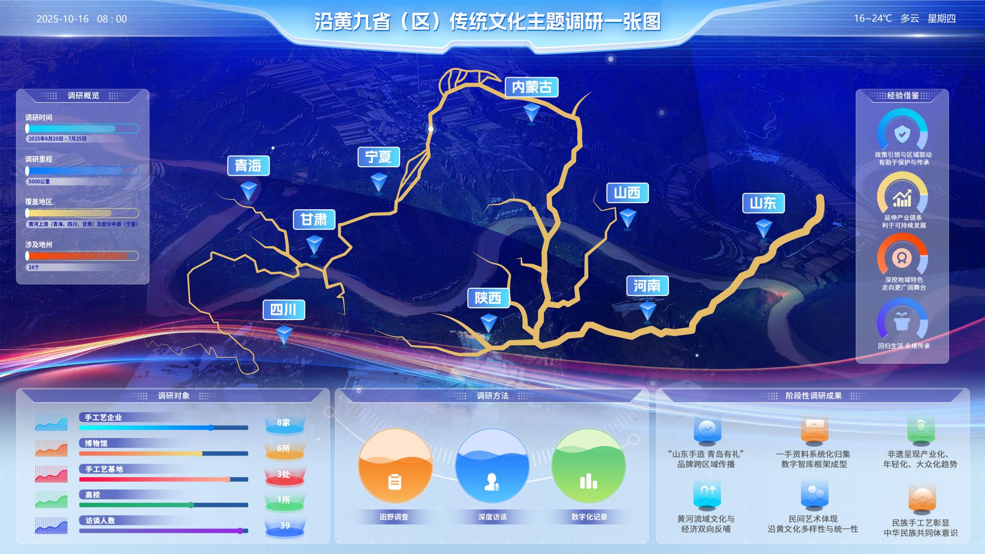 “沿著黃河遇見海”沿黃九?。▍^(qū))傳統(tǒng)文化主題調(diào)研活動于2025年6月啟動,目前已完成黃河上游及部分中游省(區(qū))的階段性考察。旨在通過系統(tǒng)性田野調(diào)查、數(shù)字化記錄、跨區(qū)域?qū)υ挼确绞?,厘清黃河流域非遺傳承現(xiàn)狀、強化文化IP、提煉有益經(jīng)驗,為青島放大“山東手造?青島有禮”影響力、塑造沿黃文化品牌提供學(xué)理支撐與實踐路徑。