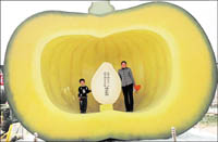 4月21日,在壽光舉辦的中國國際蔬菜博覽會上,一名從河北來的參觀者與5歲的兒子在一個巨型南瓜雕塑前合影留念。