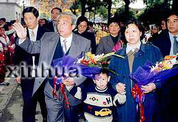 “?招l(wèi)士”王偉的父親王明(前左)、母親王月琴(前右)從北京返回浙江湖州,受到家鄉(xiāng)父老鄉(xiāng)親的歡迎!