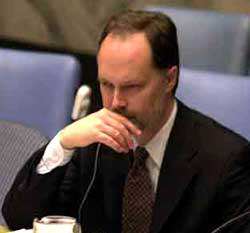 5月3日,聯(lián)合國(guó)經(jīng)濟(jì)及社會(huì)理事會(huì)舉行會(huì)議,對(duì)該理事會(huì)下屬各機(jī)構(gòu)的成員國(guó)進(jìn)行改選。美國(guó)在聯(lián)合國(guó)人權(quán)委員會(huì)的改選中落選。圖為美國(guó)駐聯(lián)合國(guó)代理大使詹姆斯·坎寧安在當(dāng)天聯(lián)合國(guó)安理會(huì)的會(huì)議上面無(wú)表情地聽著別人的發(fā)言。 |