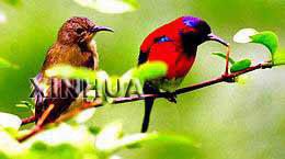 我國第一個太陽鳥館近日在昆明市滇池之畔建成開放。600余平方米的太陽鳥館放養(yǎng)著300多只來自云南省文山、紅河和西雙版納叢林的太陽鳥以及黑頭金翅等20多種鳴禽。該館的建成,既為鳥類專家研這一小型鳥種提供了基地,同時也給昆明增添了一個新的旅游景觀。 太陽鳥小巧玲瓏,為珍稀名貴的小型觀賞鳥。圖左為雌鳥,毛羽呈灰色;右為雄鳥,火紅的羽毛似太陽般璀燦艷麗 。