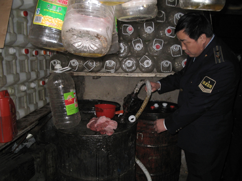 當(dāng)執(zhí)法人員走進(jìn)加工間時(shí),一陣油膩刺鼻的氣味撲鼻而來。在加工現(xiàn)場,記者看到,加工間內(nèi)堆放著100多個(gè)很臟的30公斤塑料桶和5升的塑料小桶,正準(zhǔn)備用來裝花生油。塑料桶的外包裝上標(biāo)注的是青島長生集團(tuán)股份有限公司的“長生牌”純正花生油、青島珍珠源植物油有限公司的“清爾銘牌”一級(jí)大豆油、青島嘉里植物油有限公司“;逝啤睂S么蠖褂汀A硗膺有兩只大鐵桶內(nèi)存放著劣質(zhì)花生油。據(jù)業(yè)主介紹,該店從今年一月份開始出售花生油,盛油的塑料桶是以1元錢1只的價(jià)格買來的舊油桶。就是這樣一家油店,竟在門口內(nèi)外貼著“放心花生油”的廣告。鐵桶內(nèi)的花生油是在膠州一個(gè)個(gè)體戶加工的。這種“花生油”都是現(xiàn)榨的土制油經(jīng)過自己調(diào)制而成的,比市場上賣的每公斤要便宜4元錢!