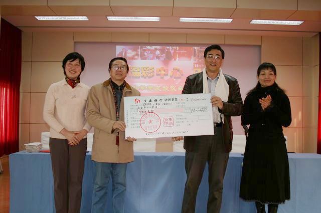 青島市福彩中心主任王增先將6萬元捐助款交到了市教育局主任督學(xué)杜小悌和中心聾校校長潘兆美的手中,這筆救助款解決了聾校里的150名學(xué)生的 學(xué)費(fèi)問題。