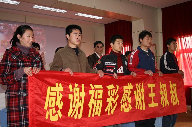 青島市福彩中心主任王增先將6萬元捐助款交到了市教育局主任督學(xué)杜小悌和中心聾校校長潘兆美的手中,這筆救助款解決了聾校里的150名學(xué)生的 學(xué)費(fèi)問題。 為表達(dá)感激,中心聾校的學(xué)子們特地制作的橫幅感謝福彩的救助。