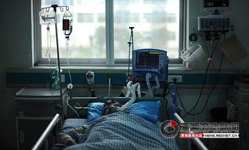 周道明正躺在湘潭市中心醫(yī)院的重癥監(jiān)護(hù)室,靠呼吸機(jī)和點(diǎn)滴維持生命。 圖/瀟湘晨報滾動新聞記者 楊抒懷