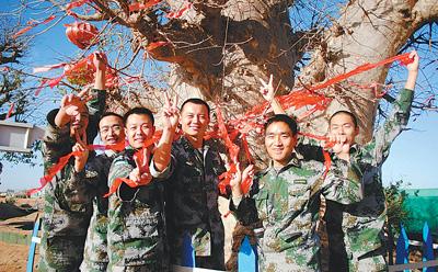 ????蘇丹達(dá)爾富爾聯(lián)合國(guó)超級(jí)營(yíng)地處于一片不毛之地,唯有中國(guó)營(yíng)區(qū)內(nèi)有兩棵參天的百年大樹,官兵們分別稱之為“常樂樹”和“常青樹”。春節(jié)來臨,中國(guó)第四批赴蘇丹達(dá)爾富爾維和大隊(duì)官兵按照慣例來到樹下,在晨風(fēng)中,系上了寄托子弟兵思念的紅綢帶(見上圖,本報(bào)記者吳文斌攝)。
