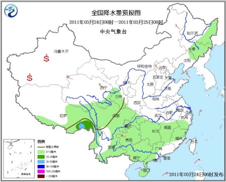 據(jù)中央氣象臺預報,3月24至27日,青藏高原南部和中東部偏南地區(qū)、新疆西南部、甘肅南部、內(nèi)蒙古東北部、東北地區(qū)中北部將有小到中雪(雨)或雨夾雪,其中,西藏東南部的局地有大雨,川西高原中部的局地有大雪;江南大部、華南、西南地區(qū)及臺灣西北部等地有小雨或陣雨,其中,云南北部的局地有大雨,貴州西部的部分地區(qū)有凍雨。