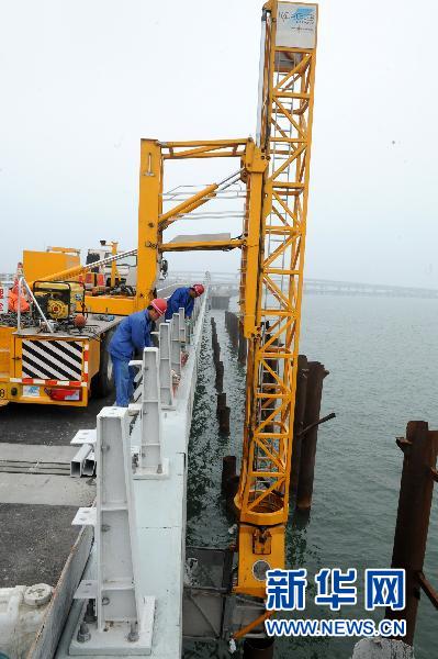 ????5日12時(shí)許,記者來(lái)到膠州灣大橋,橋上車輛來(lái)往不斷。記者從大橋青島端一路仔細(xì)查看,直抵紅島端。大橋護(hù)欄由立柱和橫欄組成,立柱每?jī)擅鬃笥矣幸粋€(gè),橫欄共有三列,總高約1.5米。立柱均已由防腐蝕螺栓固定在橋身上。絕大多數(shù)橫欄已經(jīng)固定在立柱上:只有距離青島收費(fèi)口不遠(yuǎn)處,有兩處總長(zhǎng)十五六米的缺口,工人還在安裝橫欄。橫欄每根長(zhǎng)五六米,銜接處用螺絲固定。橫欄銜接處,絕大多數(shù)已經(jīng)掛上螺絲,但僅有少數(shù)被擰緊,記者用手即可將其旋開(kāi)。