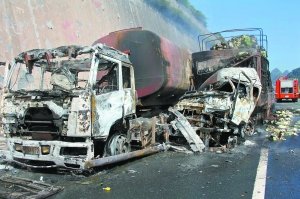 ????搶險人員抵達現(xiàn)場時發(fā)現(xiàn),事故路段黑煙滾滾,其間夾雜著烈火,煙火交織在一起高達6米多。在烈焰中央,一輛大型槽罐車被另一輛大貨車頂在槽罐處推向路肩的護坡上,滿載著甲醇的槽罐車被撞得變形泄漏?;饒鲋羞€不時傳來“噼啪”爆響,路面上飛濺著許多燒毀的機械碎片和燒焦的貨物,空氣中彌漫著一股難聞的燒焦的塑膠制品氣味。