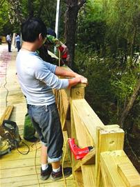 ????昨天下午,記者來到延安一路,看到從延安一路市園林局門口到動(dòng)物園西門口之間的鐵欄桿已經(jīng)不見了,這里新建了別致的木棧道。 “這個(gè)木棧道真是不錯(cuò)! ”市民孫廣路走在木棧道上,高興地對(duì)記者說,“走在上面,不僅可以欣賞到公園里的景色,而且還為行人提供了一處休閑的地方。 ”在現(xiàn)場,記者看到,木棧道依著公園山林的走勢曲折而建,可以容納兩三個(gè)人同時(shí)并排而行。