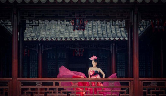 干露露古宅拍攝大片 穿桃色紗裙妖艷動(dòng)人(圖)