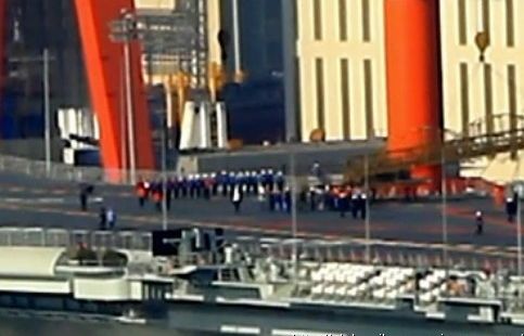 視頻畫面顯示,身著紅、白、藍等多種顏色標志服的海軍人員在甲板上集合,該服裝類似美國艦載航空兵服務保障人員的馬甲。這些海軍很有可能是瓦良格航母上的空勤人員,這也說明航母艦載機可能在不久后試飛。