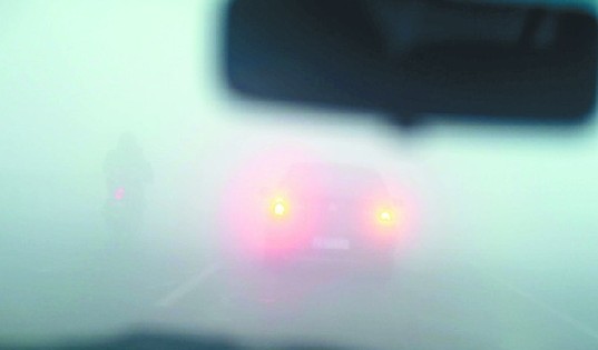 記者駕車通往大霧彌漫的事故現(xiàn)場,能見度極低。