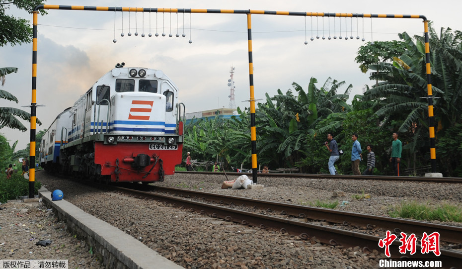 1月17日,印度尼西亞勿加泗,工人在鐵道上方懸掛柚子大小的混凝土球,這是鐵路部門為嚴(yán)懲扒車者而出臺(tái)的措施。印度尼西亞勿加泗鐵路部門為嚴(yán)懲扒車者,將水泥球懸掛在距離車頂約40厘米的地方。印尼鐵路部門希望這些巨型球可以斷了乘客扒車的念頭。