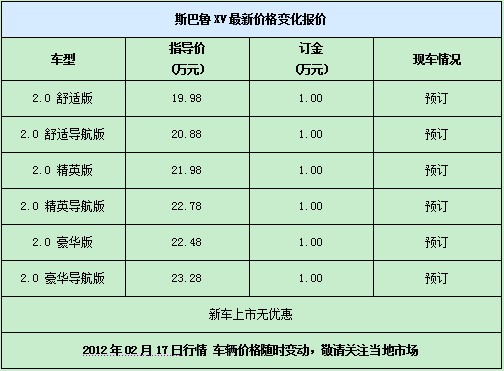 ????青島新聞網(wǎng)汽車訊 編輯近日從青島冀騰斯巴魯汽車銷售有限公司獲悉,斯巴魯XV現(xiàn)已接受預(yù)訂,訂金1萬元,下周五現(xiàn)車即將到店,對斯巴魯XV感興趣的朋友可具體咨詢經(jīng)銷商詳情。